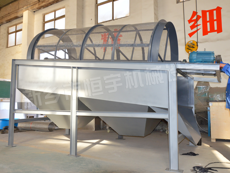 滾筒篩是電動機通過減速器、聯(lián)軸器驅(qū)動傾斜安裝于機架上的滾筒繞其軸線轉(zhuǎn)動;當物料進入滾筒后,由于滾筒的傾斜與轉(zhuǎn)動,篩面上的物料不斷翻轉(zhuǎn)與滾動的同時,自上而下通過分級篩網(wǎng)析出,由于篩網(wǎng)規(guī)格不同,物料逐漸被分離篩選,粒度合格的物料(篩下物)經(jīng)篩分后落入到各自的下料斗中,不合格的物料(篩上物)經(jīng)滾筒尾部的排料口排出;由于物料在滾筒內(nèi)的翻轉(zhuǎn)、滾動,使卡在篩孔中的物料可被彈出,防止了篩孔堵塞。